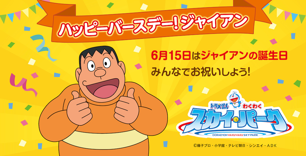 「パークゾーン」プレイエリアでジャイアンの誕生日会を開催するよ! ジャイアンにちなんで、誰が一番大きな声を出せるかを競う「大声コンテスト」のイベントも実施するよ!参加をすると素敵なプレゼントがもらえるよ!ぜひ、参加してね!
