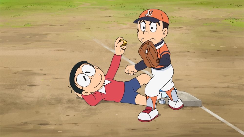 そして試合が始まり、のび太がフォアボールでめずらしく出塁するが、足がおそいせいで二塁には間に合わず、ダブルプレーを取られてしまう。その次もフォアボールで一塁はふめたものの、今度はリードを取りすぎて、一塁にもどる前にタッチアウト…。みんなから、のび太のせいで負けたとせめられてしまう。